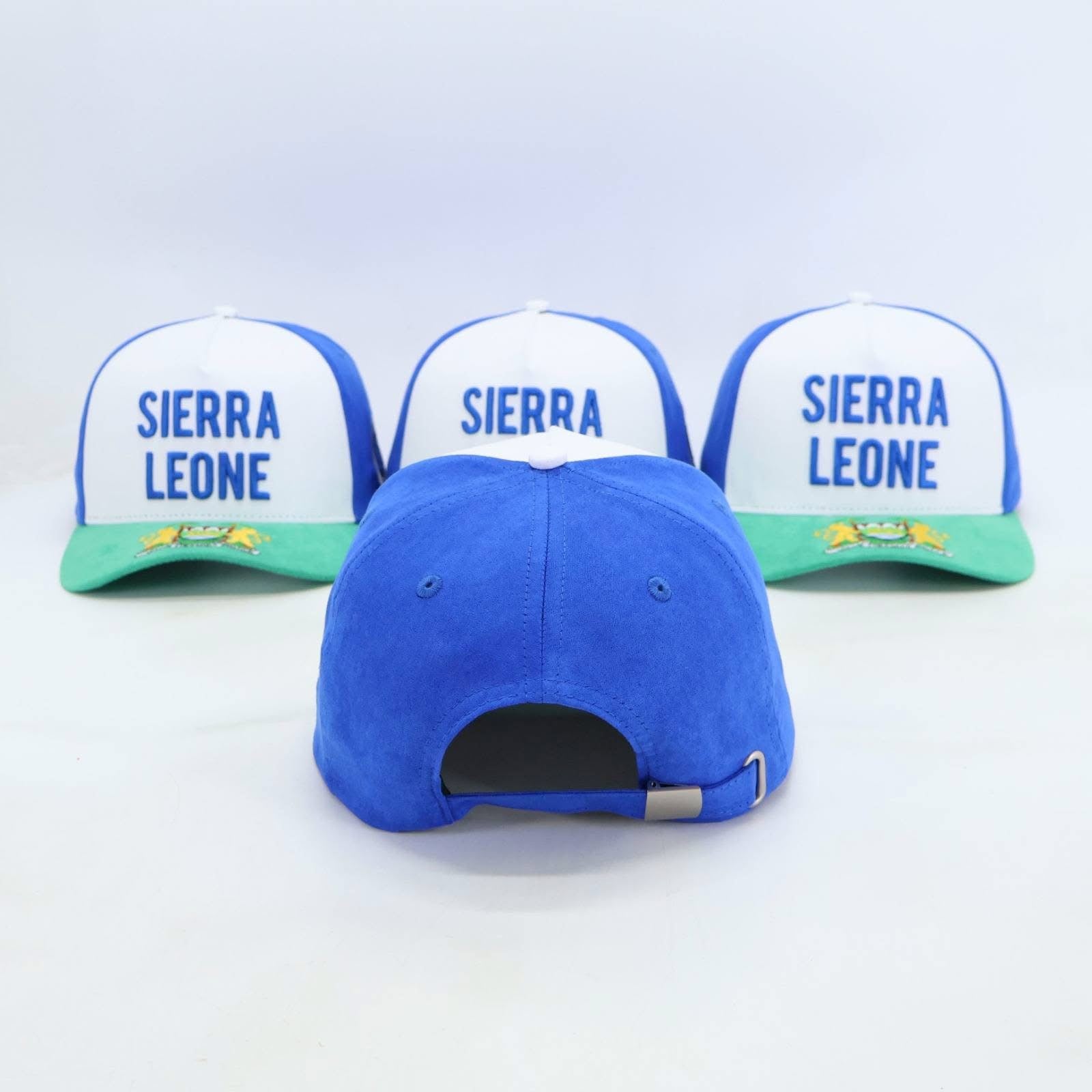 Crafted from soft, rich suede fabric, the hat features a vibrant royal blue crown and a unique green suede brim with a subtle frog motif. The front is boldly embroidered with "SIERRA LEONE" in blue on a crisp white panel.