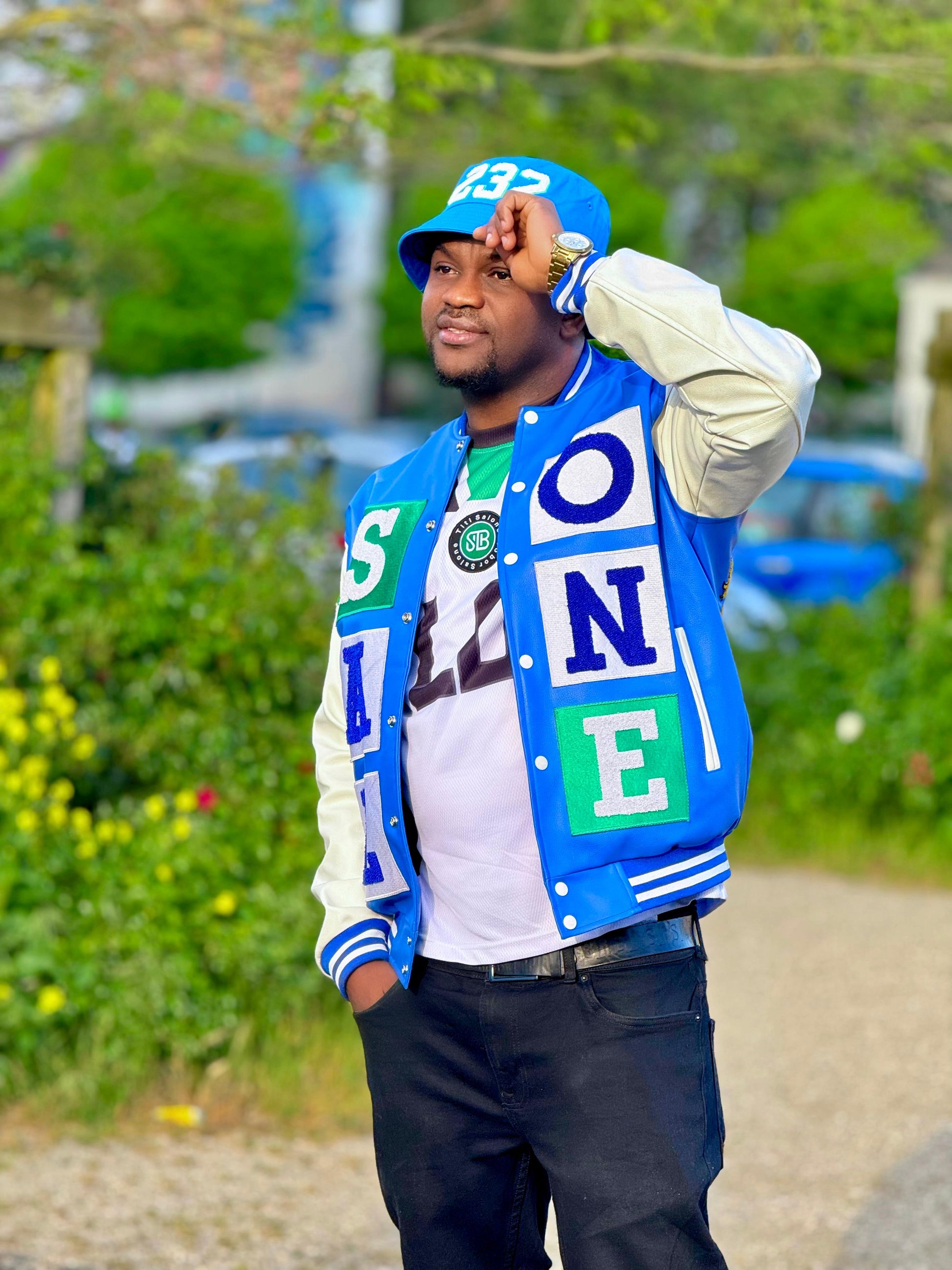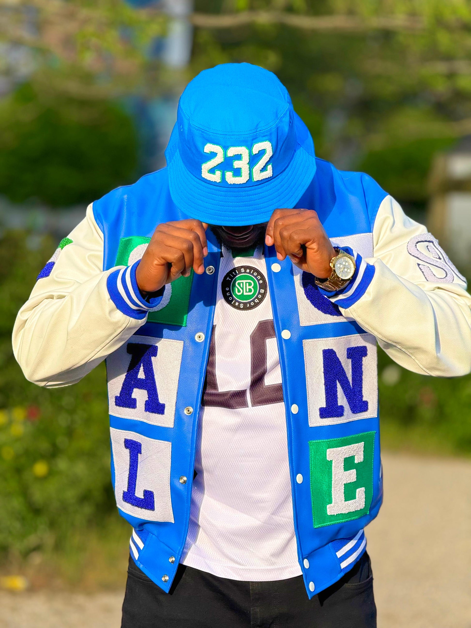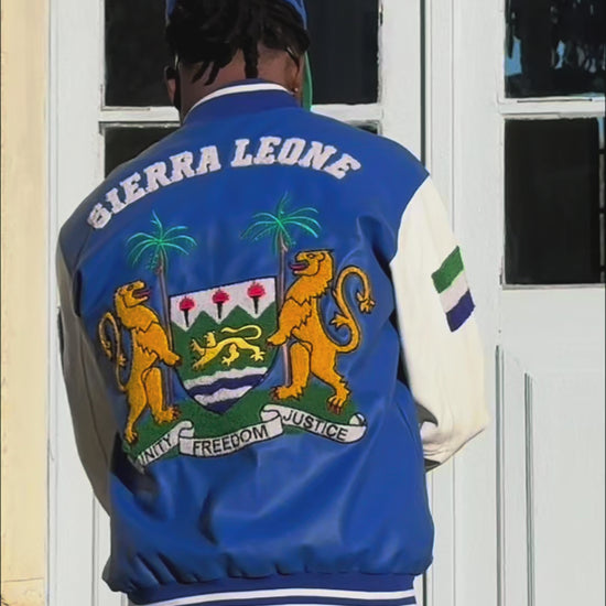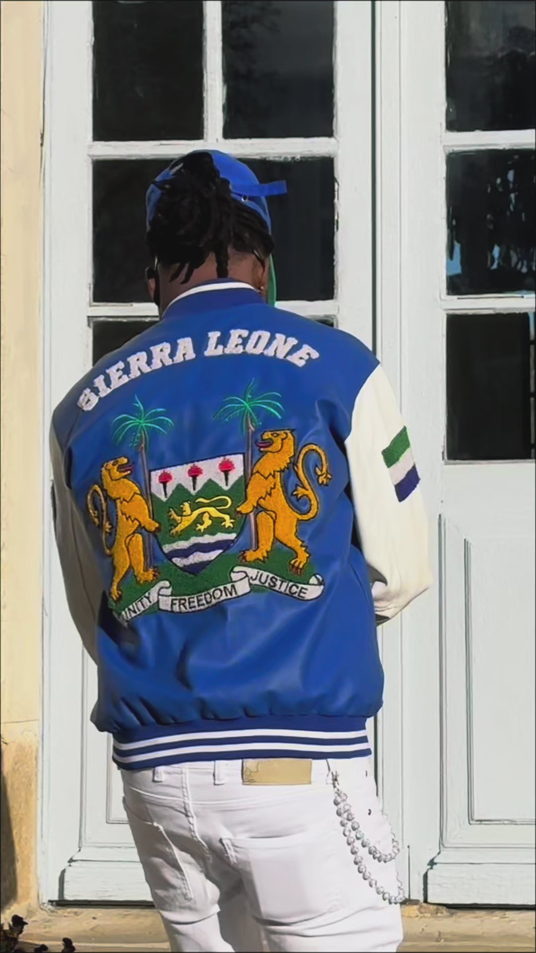 • Coordinating Style: The jacket is perfectly complemented by the matching bright blue bucket hat embroidered with "232"—the country code for Sierra Leone—and a simple white jersey shirt worn underneath.