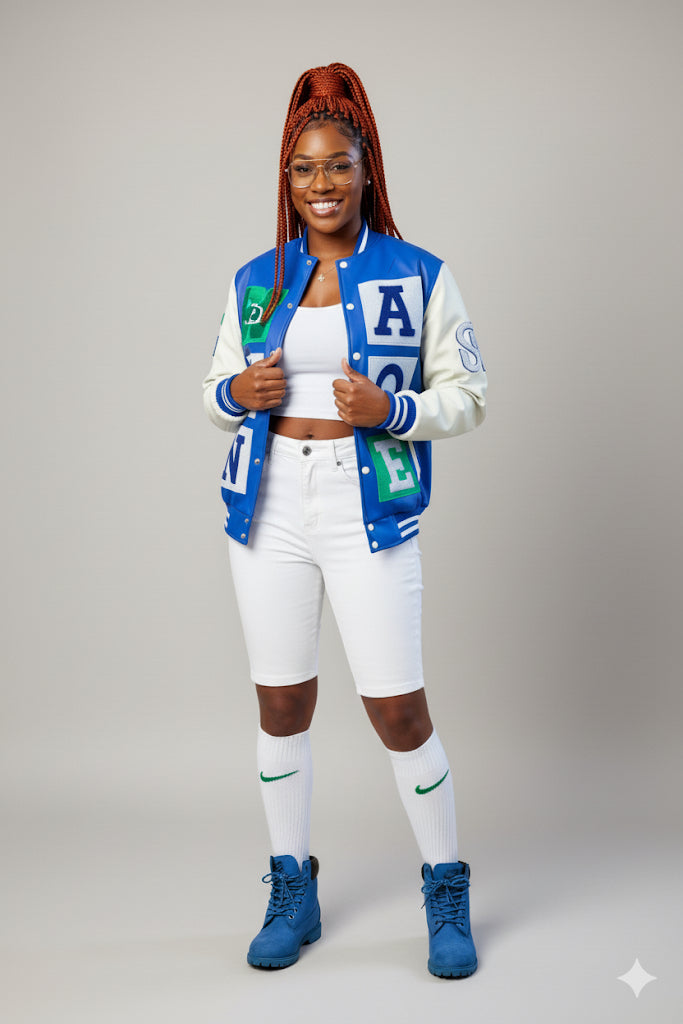 This premium varsity-style jacket is a vibrant tribute, featuring the bold colors of blue, white, and green. The main body of the jacket is a vibrant royal blue, beautifully contrasted by crisp white leather sleeves that give it a classic collegiate look.